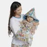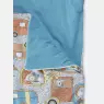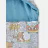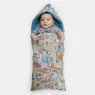 Saco de dormir para crianças de até 1 ano, com abertura por zíper, tendo uma face tecido estampado e outra em tecido colorido liso e capuz, confeccionado em tecido meia-malha 100% algodão, além de enchimento 100% poliéster