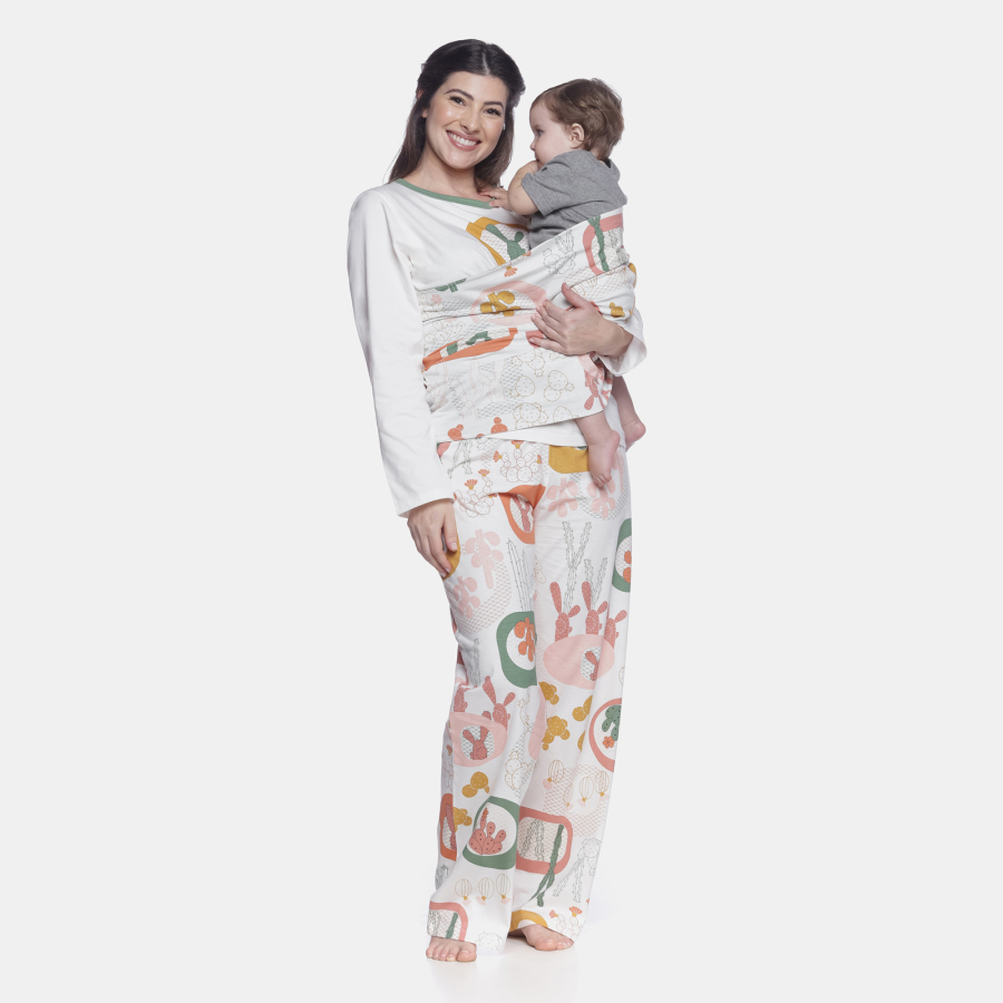 Sling dupla face, sendo uma face com estampa corrida e outra em tecido colorido, com extremidades pespontadas, confeccionado em tecido meia-malha 100% algodão.