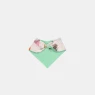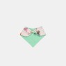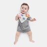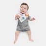 Babador com fechamento por laço, sendo uma face com estampa corrida em tecido meia malha 100% algodão e outra em tecido liso atoalhado (85% algodão / 15% poliéster).