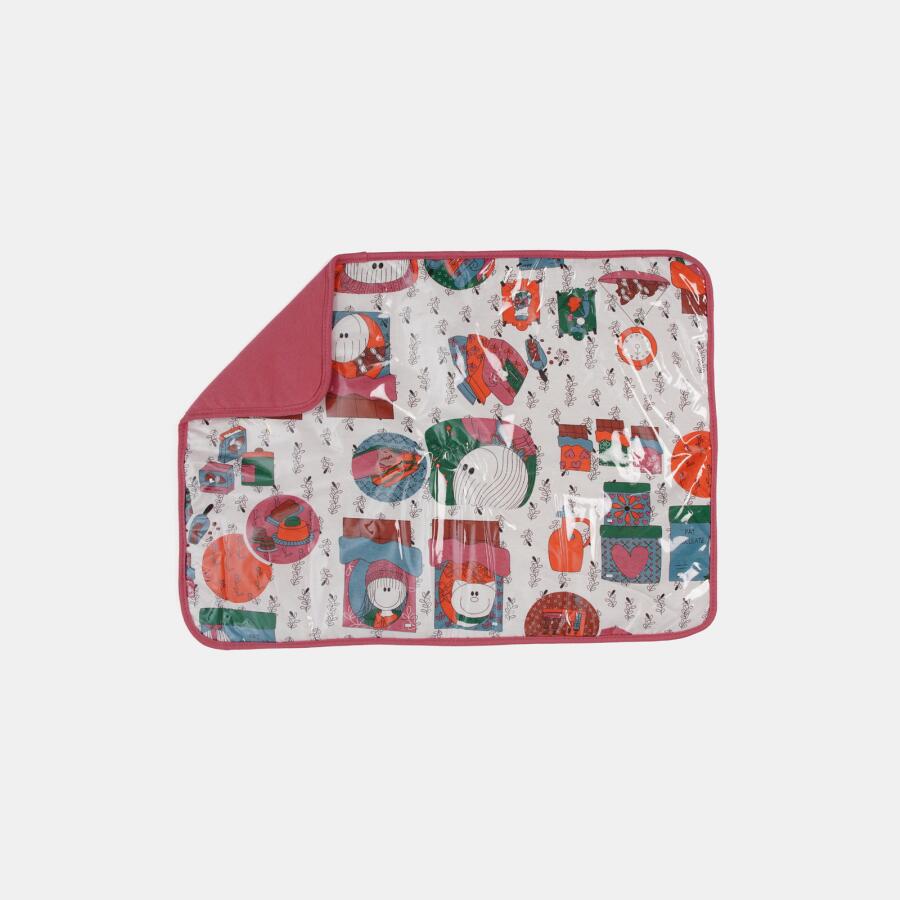 Trocador com plástico protetor, lavável, sendo um lado estampado com personagem e outro estampado sem personagem, confeccionado meia-malha (100% algodão) e enchimento (100% poliéster).