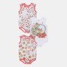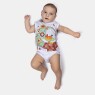 Kit body cavado, composto por 3 unidades, sendo duas com estampa corrida e uma com estampa local, confeccionados em tecido meia-malha 100% algodão.
