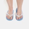 Chinelo com tiras em estampa corrida e base em tecido colorido, confeccionado em tecido meia-malha 100% algodão, enchimento 100% poliéster e sola em EVA.