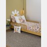 Colcha tamanho solteiro, sendo uma face tecido estampado com personagem e a outra tecido colorido, ambos meia-malha 100% algodão e enchimento 100% poliéster