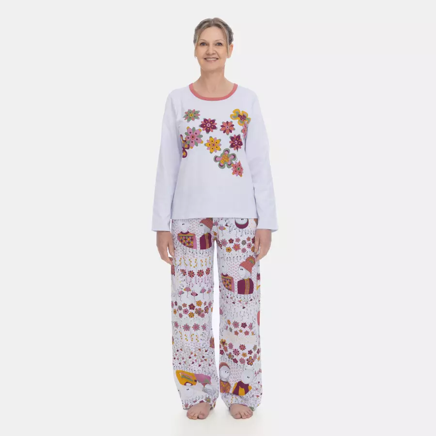 Pijama manga longa com estampa local e calça com estampa corrida, confeccionados em tecido meia-malha 100% algodão.