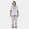 Conjunto pijama manga curta com estampa local e detalhe em viés e calça com estampa corrida, confeccionados em tecido meia-malha 100% algodão.