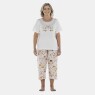 Conjunto pijama manga curta com estampa local e detalhe em viés e corsário com estampa corrida, confeccionados em tecido meia-malha 100% algodão.