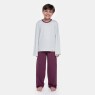 Pijama manga longa com etiqueta, em tecido liso e calça em tecido colorido, confeccionados em tecido meia-malha 100% algodão.