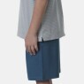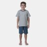 Conjunto manga curta em tecido listrado, etiqueta e bermuda em tecido colorido, confeccionados em tecido meia-malha 100% algodão.