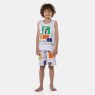 Pijama regata com estampa local e bermuda com estampa corrida, confeccionados em tecido meia-malha 100% algodão.