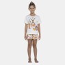 Conjunto pijama manga curta com detalhe em viés no decote e estampa local na parte frontal, e short com estampa corrida, confeccionados em tecido meia-malha 100% algodão.