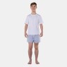 Pijama manga curta em tecido liso, etiqueta, em tecido meia-malha 100% algodão e short com padronagem xadrez, confeccionado em tecido tricoline 100% algodão.