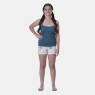 Conjunto de alça, lastex, em tecido colorido cotton (96% algodão / 4% elastano) e short com estampa corrida em tecido meia-malha 100% algodão.