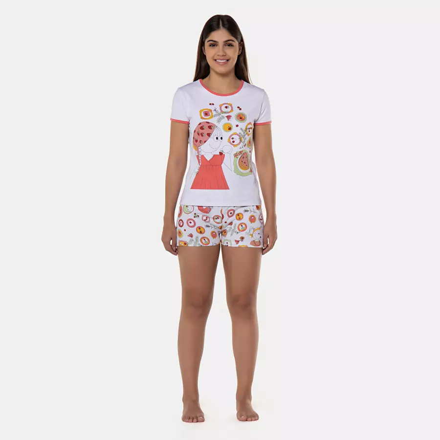 Pijama manga curta baby-look com estampa local em tecido cotton (96% algodão e 4% elastano) e short com estampa corrida, confeccionado em tecido meia-malha 100% algodão.