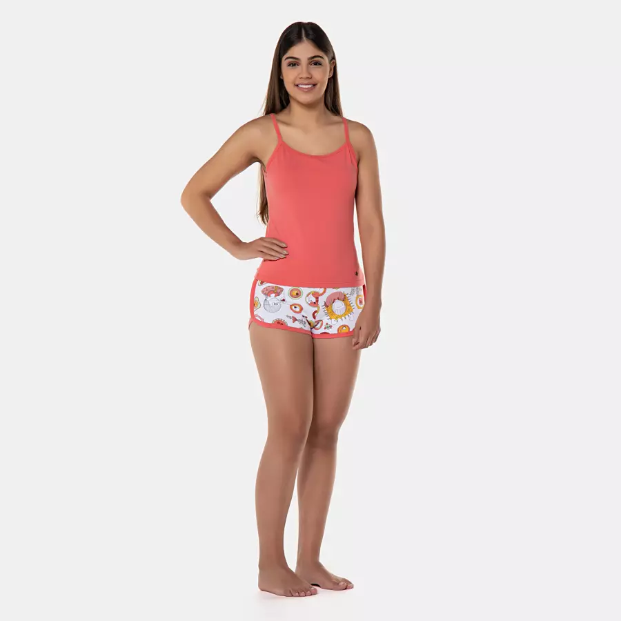 Pijama de alça em tecido colorido com plaquinha metálica e short com estampa corrida, confeccionados em tecido cotton (96% algodão / 4% Elastano).