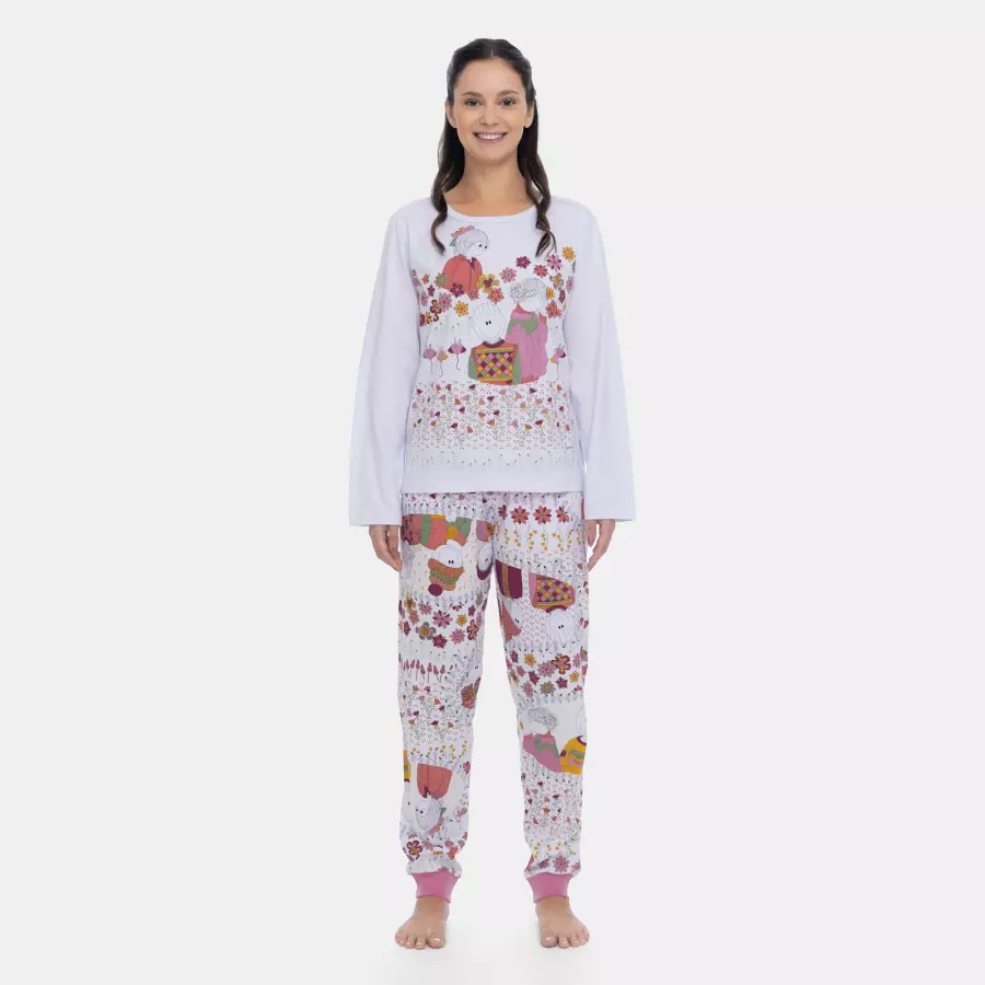 Pijama Feminino Adulto Manga Longa e Calça Estampada