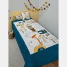 Edredom tamanho solteiro, sendo uma das faces em estampa local com personagem e a outra em tecido colorido, ambos meia-malha 100% algodão e enchimento 100% poliéster.