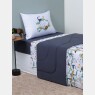 Edredom tamanho casal, sendo uma face em tecido estampado com personagem e a outra em tecido colorido, ambos meia-malha 100% algodão e enchimento 100% poliéster. Não acompanha outras fronhas avulsas, almofadas, lençol, boneco e outros acessórios expostos na imagem. Imagem meramente ilustrativa.