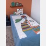 Edredom tamanho solteiro, sendo uma face tecido colorido e estampa local com personagem e a outra tecido colorido, ambos meia-malha 100% algodão e enchimento 100% poliéster. Não acompanha, outras fronhas avulsas, almofadas lençol, boneco e outros acessórios expostos na imagem. Imagem meramente ilustrativa.