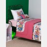 Edredom tamanho solteiro, sendo uma face em tecido estampado com personagem e a outra em tecido colorido, ambos meia-malha 100% algodão e enchimento 100% poliéster. Não acompanha outras fronhas avulsas, almofadas, lençol, boneco e outros acessórios expostos na imagem. Imagem meramente ilustrativa.