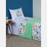 Edredom tamanho berço, sendo uma das faces em tecido estampado com personagem e a outra em tecido colorido, ambos meia-malha 100% algodão e enchimento 100% poliéster. Não acompanha outras fronhas avulsas, almofadas, lençol, boneco e outros acessórios expostos na imagem. Imagem meramente ilustrativa.