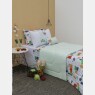 Edredom tamanho solteiro, sendo uma das faces em tecido estampado com personagem e a outra em tecido colorido, ambos meia-malha 100% algodão e enchimento 100% poliéster. Não acompanham outras fronhas avulsas, almofadas, lençol, boneco e outros acessórios expostos na imagem. Imagem meramente ilustrativa.