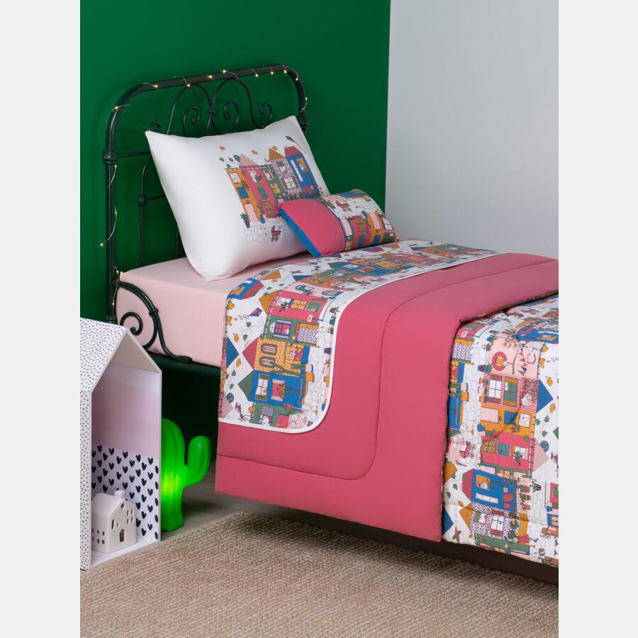 Jogo de lençol, tamanho queen, composto por 1 lençol com elástico em tecido colorido meia-malha 100% algodão, 1 sobre lençol estampado com personagem em tecido meia-malha 100% algodão e 2 fronhas com estampa local em tecido meia-malha 100% algodão. Não acompanha, outras fronhas avulsas, almofadas e outros acessórios expostos na imagem. Imagem meramente ilustrativa.