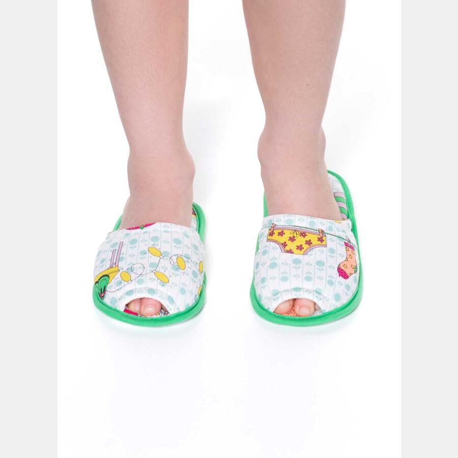 Pantufa com abertura e estampa corrida, confeccionada em tecido meia-malha 100% algodão, enchimento 100% poliéster e sola em EVA. Imagem ilustrativa, podendo ocorrer variações na posição da estampa.