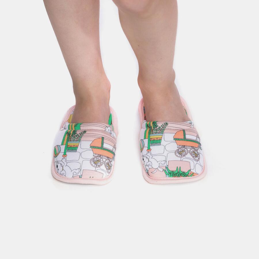 Pantufa fechada com estampa corrida, confeccionada em tecido meia-malha 100% algodão, enchimento 100% poliéster e sola em EVA. Imagem ilustrativa, podendo ocorrer variações na posição da estampa.