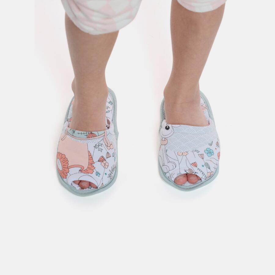 Pantufa aberta, com estampa corrida, confeccionada em tecido meia-malha 100% algodão, enchimento 100% poliéster e sola em EVA. Imagem ilustrativa, podendo ocorrer variações na posição da estampa.