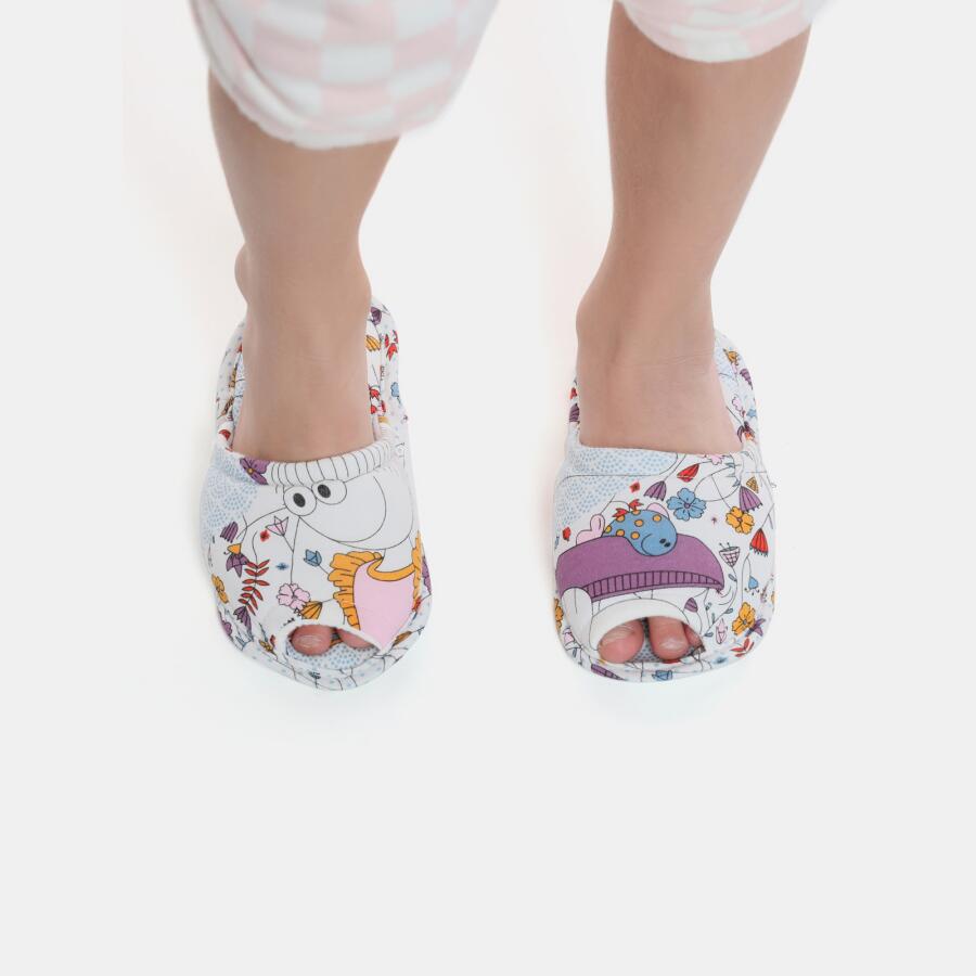 Pantufa aberta, com estampa corrida, confeccionada em tecido meia-malha 100% algodão, enchimento 100% poliéster e sola em EVA. Imagem ilustrativa, podendo ocorrer variações na posição da estampa.