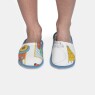 Pantufa fechada, com estampa corrida, confeccionada em tecido meia-malha 100% algodão, enchimento 100% poliéster e sola em EVA.