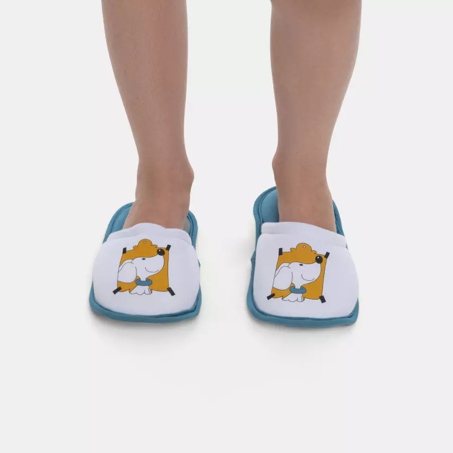 Pantufa fechada com estampa local, confeccionada em tecido meia-malha 100% algodão, enchimento 100% poliéster e sola em EVA.