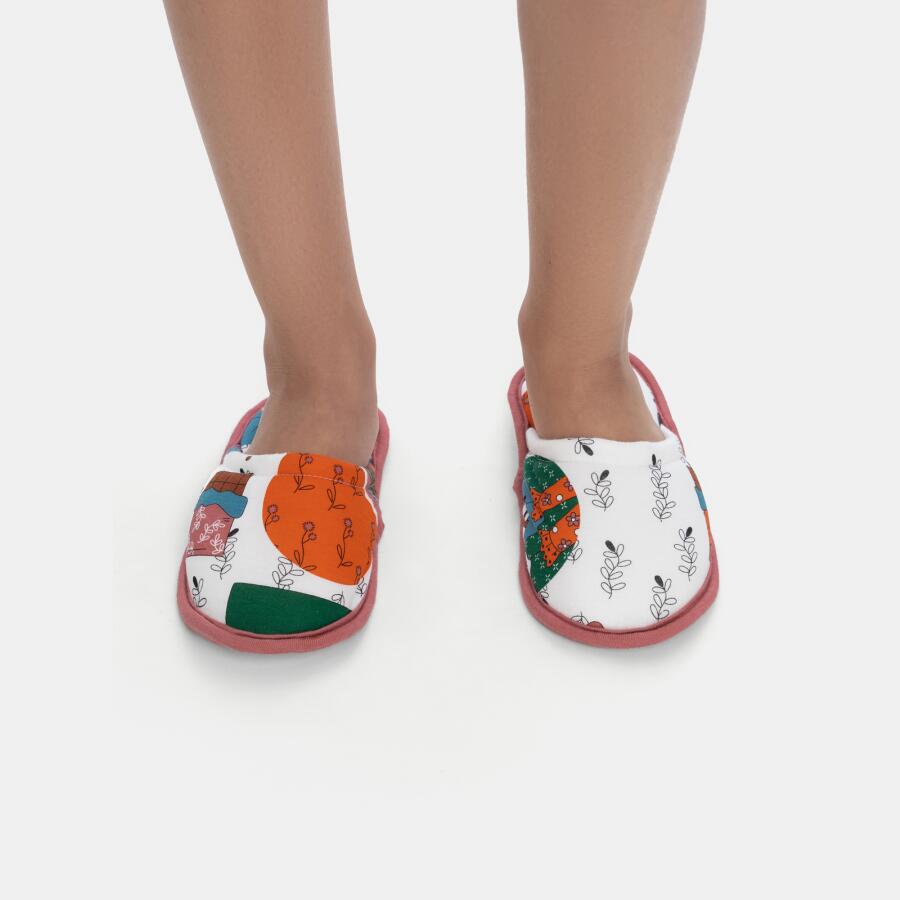 Pantufa fechada com estampa corrida, confeccionada em tecido meia-malha 100% algodão, enchimento 100% poliéster e sola em EVA.