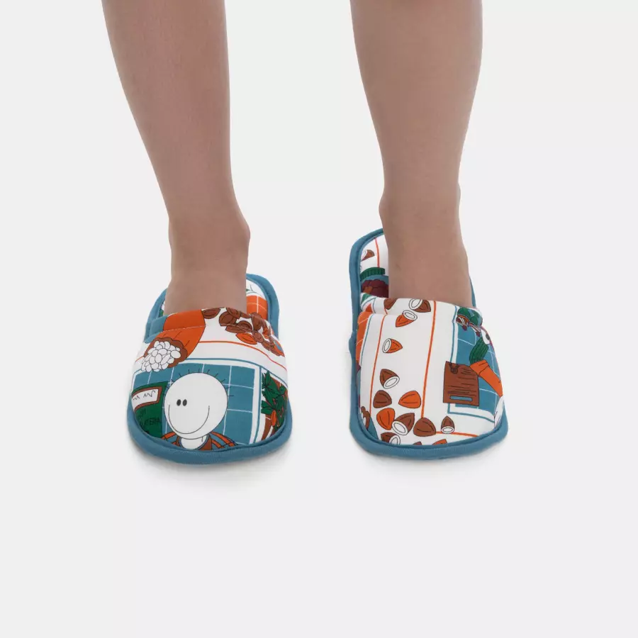 Pantufa fechada com estampa corrida, confeccionada em tecido meia-malha 100% algodão, enchimento 100% poliéster e sola em EVA.