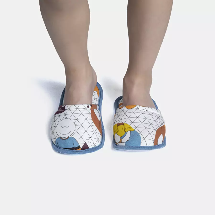 Pantufa fechada com estampa corrida, confeccionada em tecido meia-malha 100% algodão, enchimento 100% poliéster e sola em EVA.
