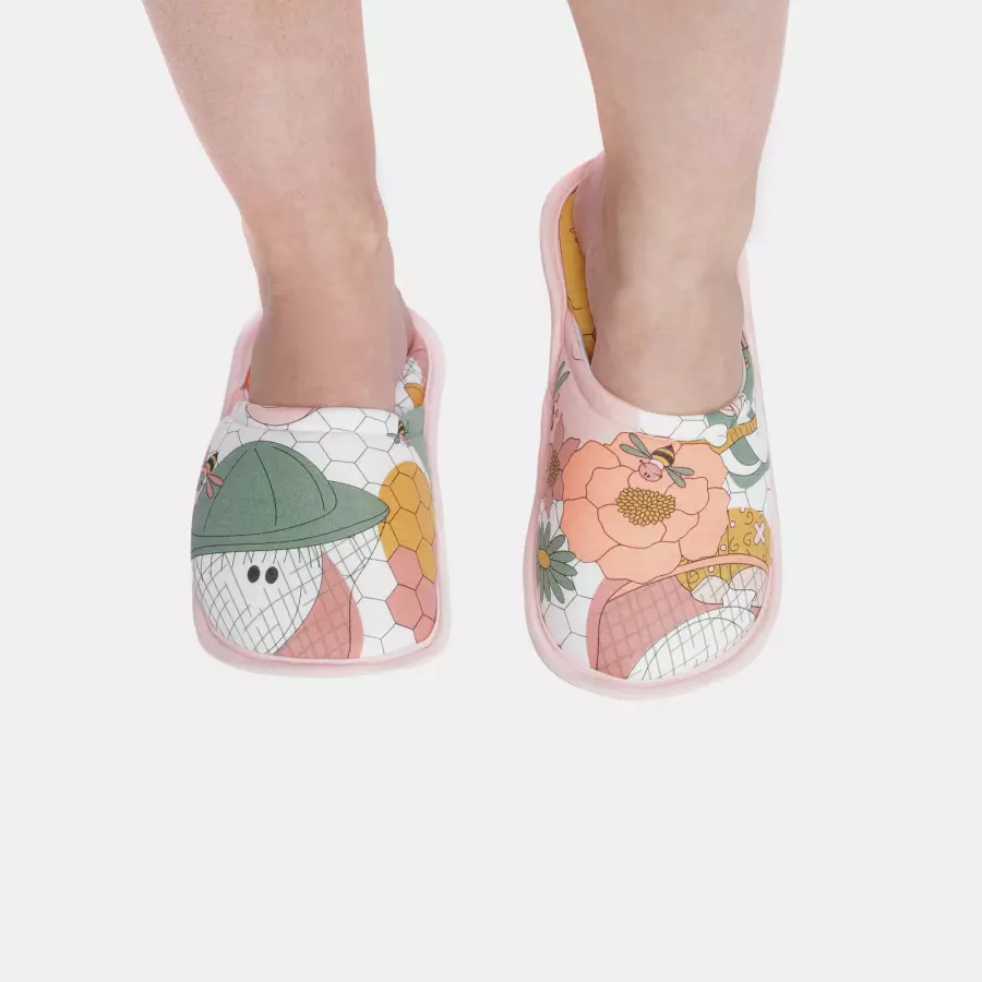 Pantufa fechada, com estampa corrida, confeccionada em tecido meia-malha 100% algodão, enchimento 100% poliéster e sola em EVA. Imagem ilustrativa, podendo ocorrer variações na posição da estampa.
