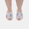 Pantufa com abertura confeccionada com estampa corrida meia-malha 100% algodão, enchimento 100% poliéster e sola em EVA.