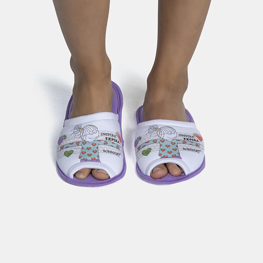 Pantufa aberta com estampa local, confeccionada em tecido meia-malha 100% algodão, enchimento 100% poliéster e sola em EVA.