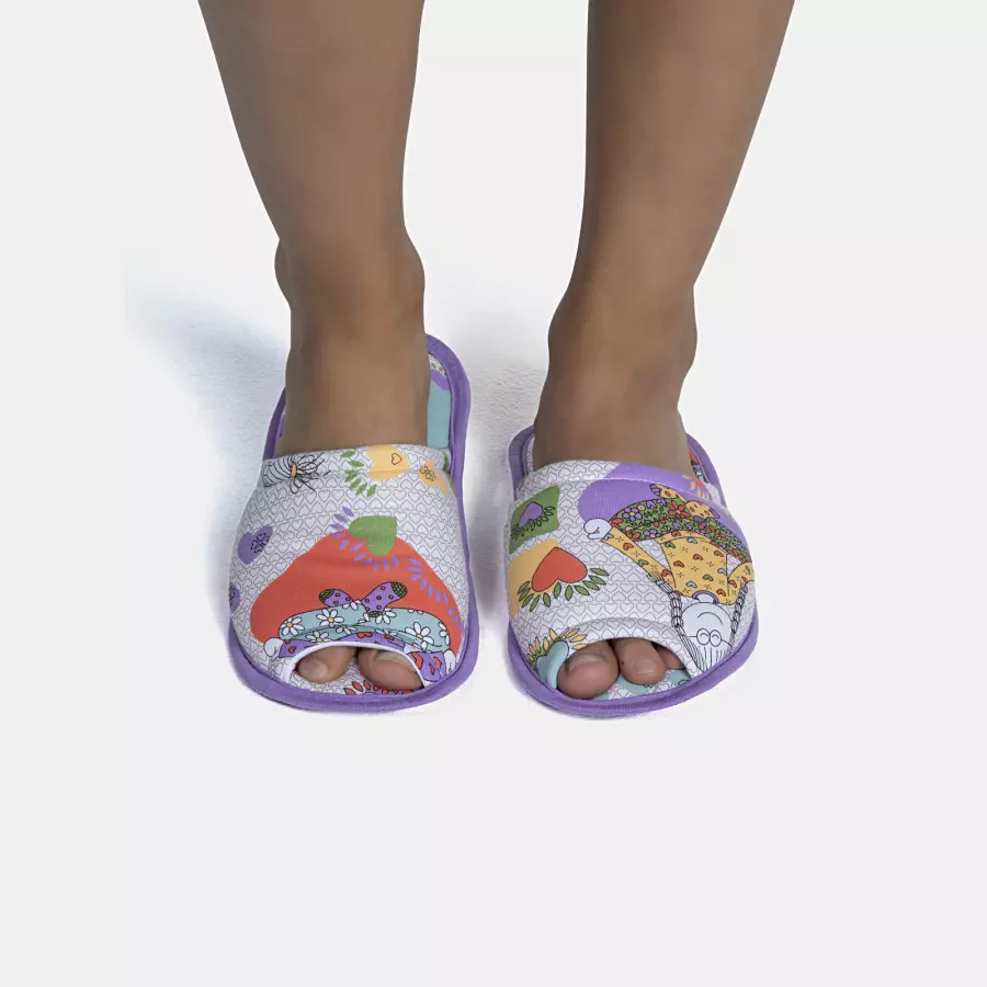 Pantufa com abertura e estampa corrida, confeccionada em tecido meia-malha 100% algodão, enchimento 100% poliéster e sola em EVA.