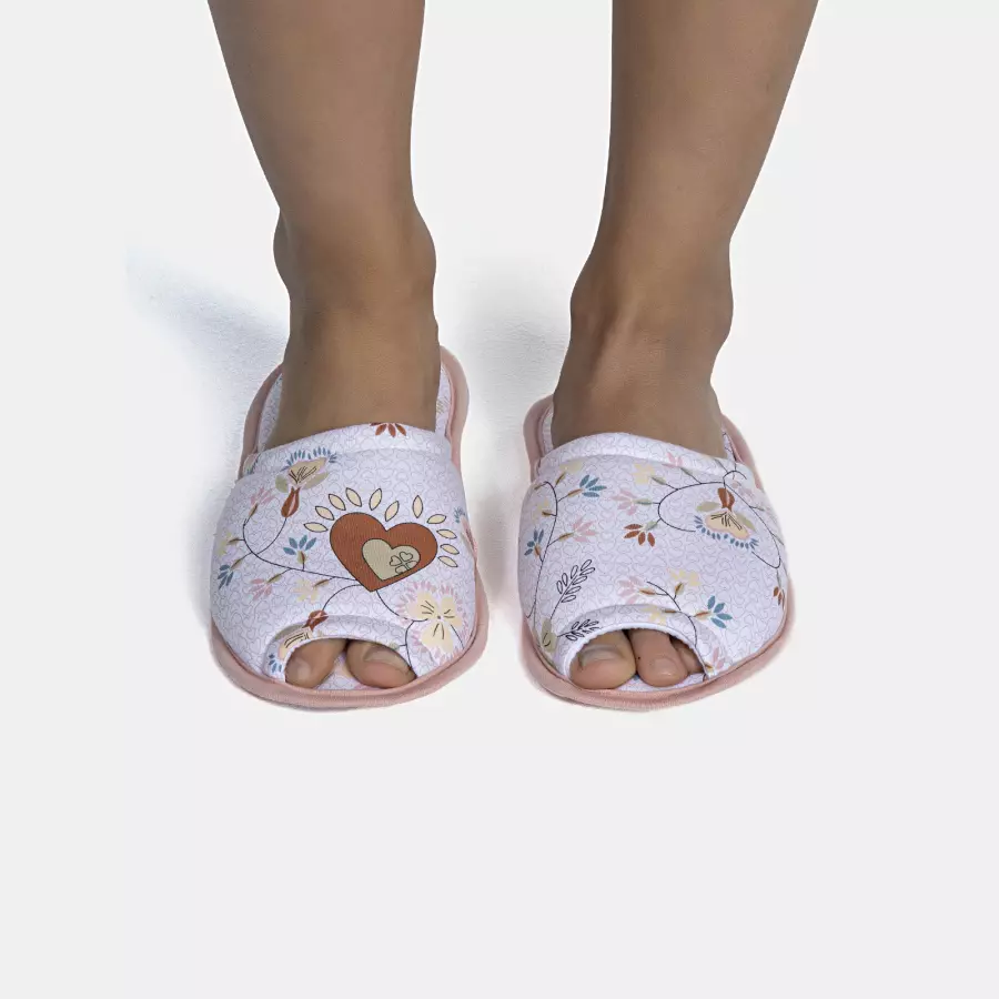 Pantufa com abertura e estampa corrida, confeccionada em tecido meia-malha 100% algodão, enchimento 100% poliéster e sola em EVA.