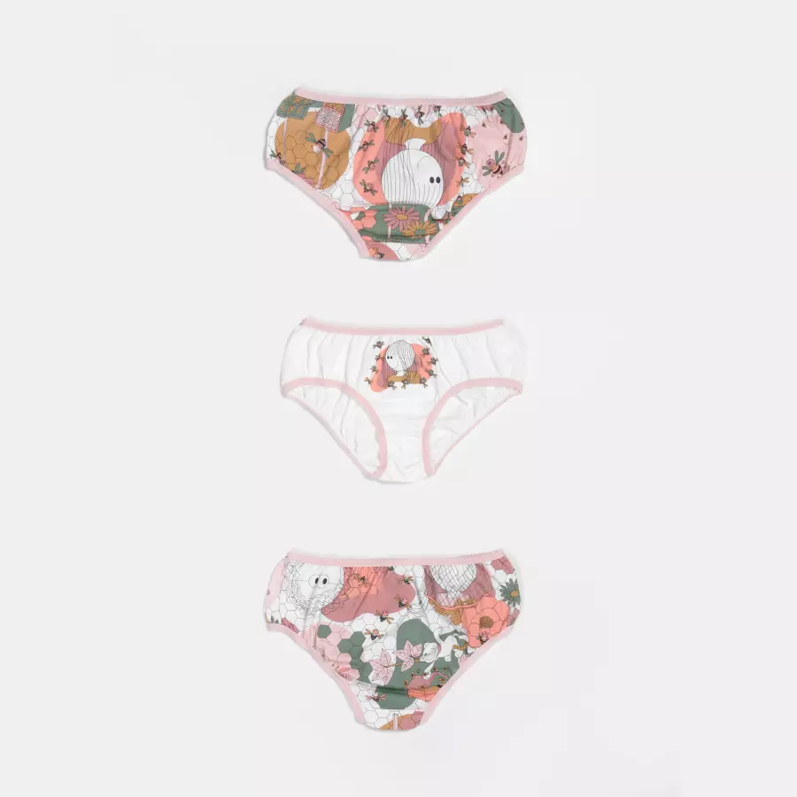 Kit composto por 3 unidades de calcinhas, sendo duas com estampa corrida e uma com estampa local, elástico nas bordas, confeccionadas em tecido meia-malha 100% algodão.