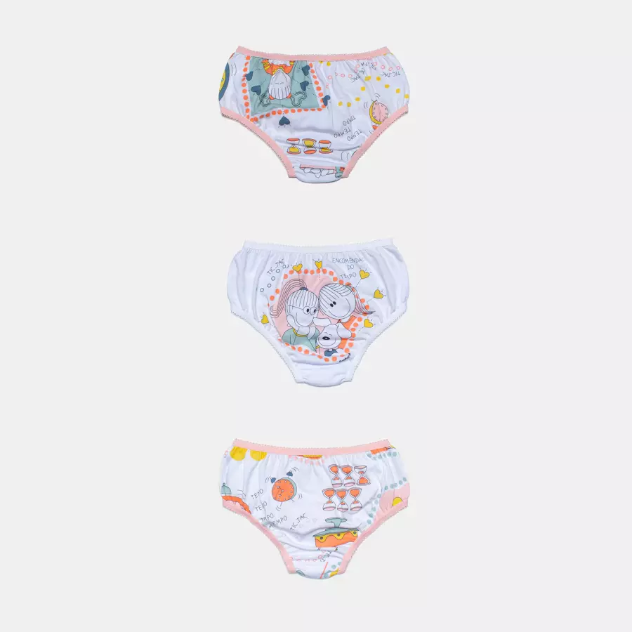 Kit composto por 3 unidades de calcinhas, sendo duas com estampa corrida e uma com estampa local, elástico nas bordas, confeccionadas em tecido meia-malha 100% algodão.