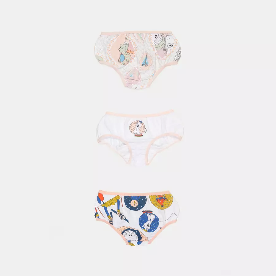 Kit composto por 3 unidades de calcinhas, sendo duas com estampa corrida e uma com estampa local, elástico nas bordas, confeccionadas em tecido meia-malha 100% algodão.