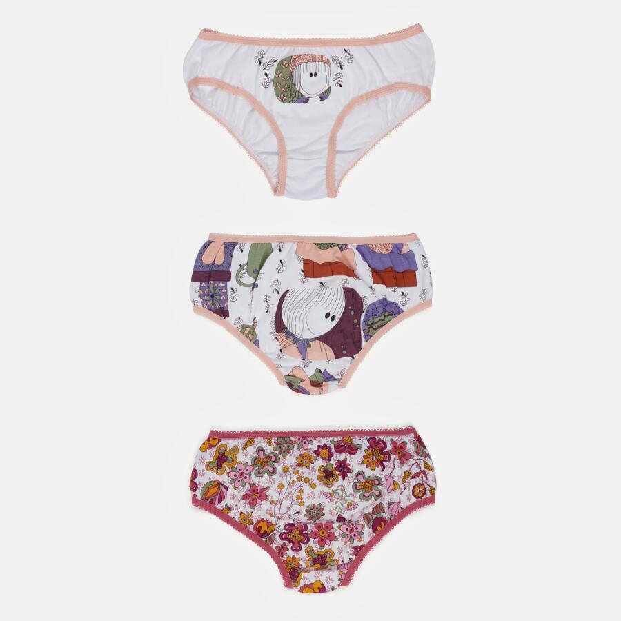 Kit composto por 3 unidades de calcinhas, sendo duas com estampa corrida e uma com estampa local, elástico nas bordas, confeccionadas em tecido meia-malha 100% algodão.