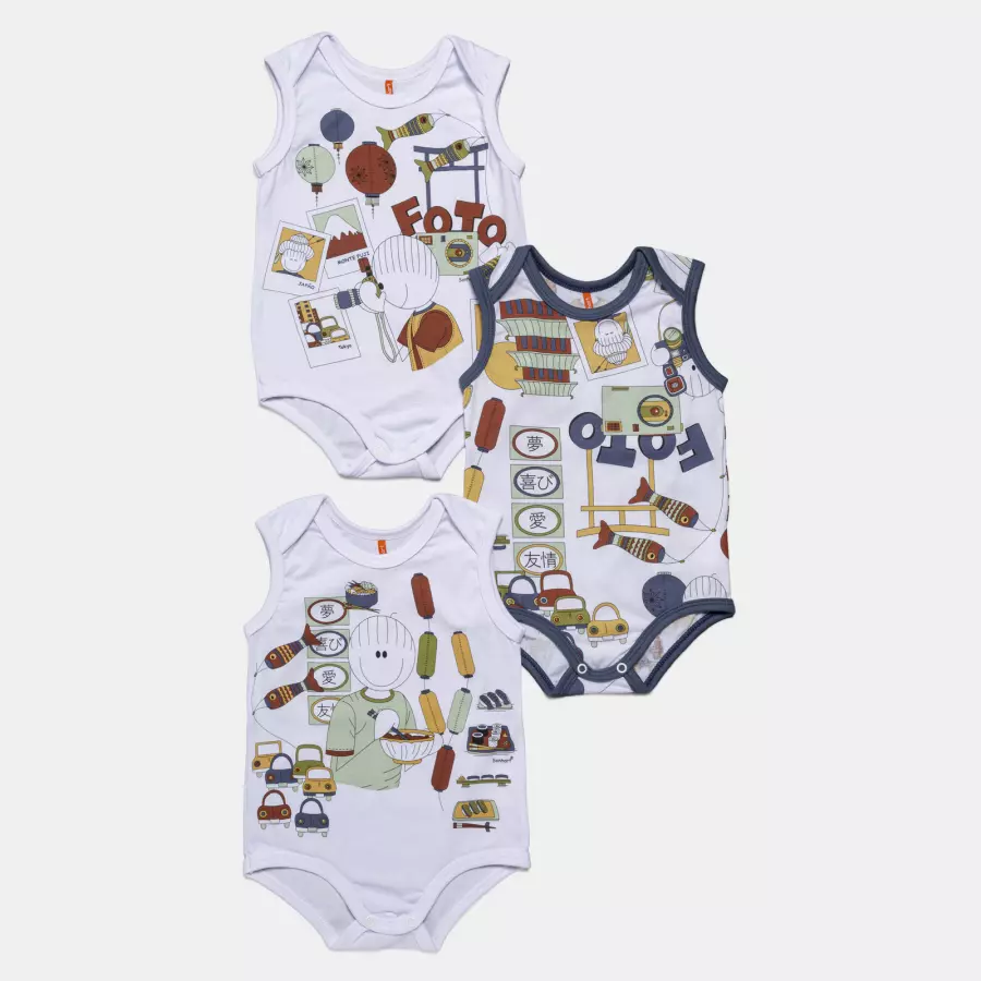 Kit body sem mangas composto por 3 unidades, sendo duas com estampa local e uma com estampa corrida, com abertura entrepernas e fechamento em botões tic-tac, confeccionados em tecido meia-malha 100% algodão.