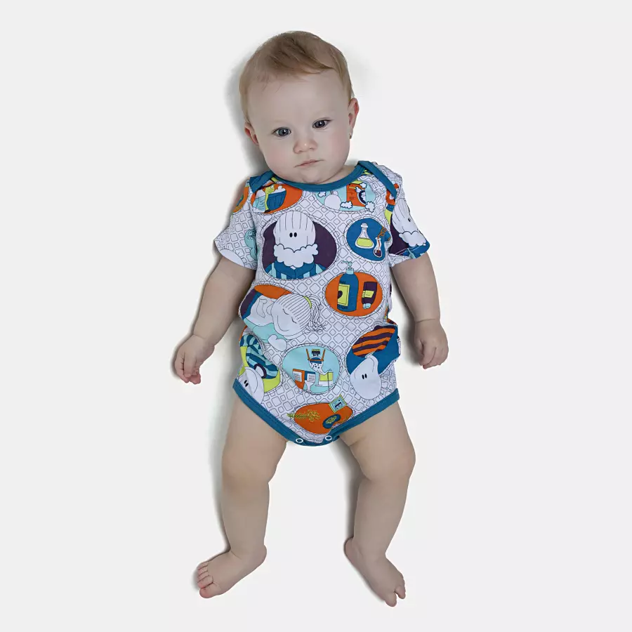 Body manga curta com estampa corrida, com abertura entrepernas, confeccionado em tecido meia-malha 100% algodão.