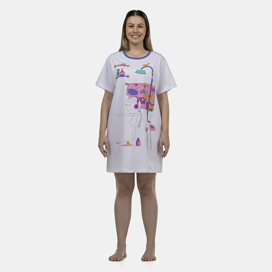 Camisão manga curta com estampa local na parte frontal e detalhe em viés no decote, confeccionado em tecido meia-malha 100% algodão.