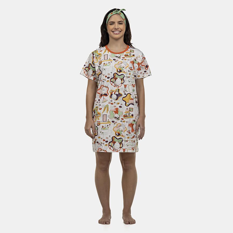 Camisão manga curta com estampa corrida e detalhe em viés no decote, confeccionado em tecido meia-malha 100% algodão.