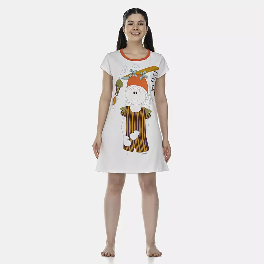 Camisão manga curta acinturado com estampa local na parte frontal e detalhe em viés na gola, confeccionado em tecido meia-malha 100% algodão.