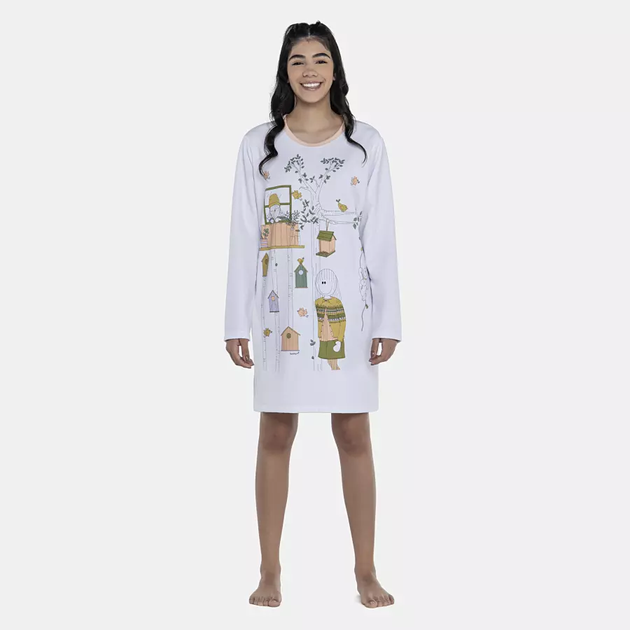 Camisão manga longa com estampa local na parte frontal e detalhe em viés no decote, confeccionado em moletinho peluciado 50% algodão e 50% poliéster.